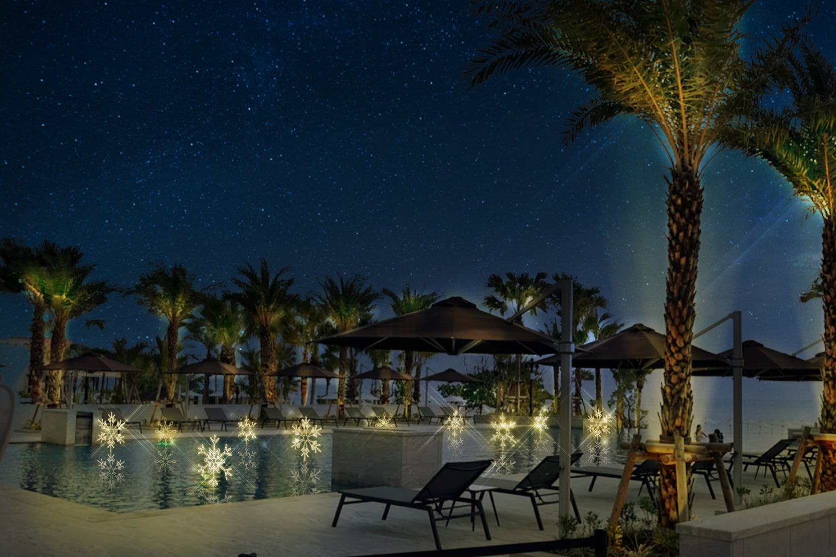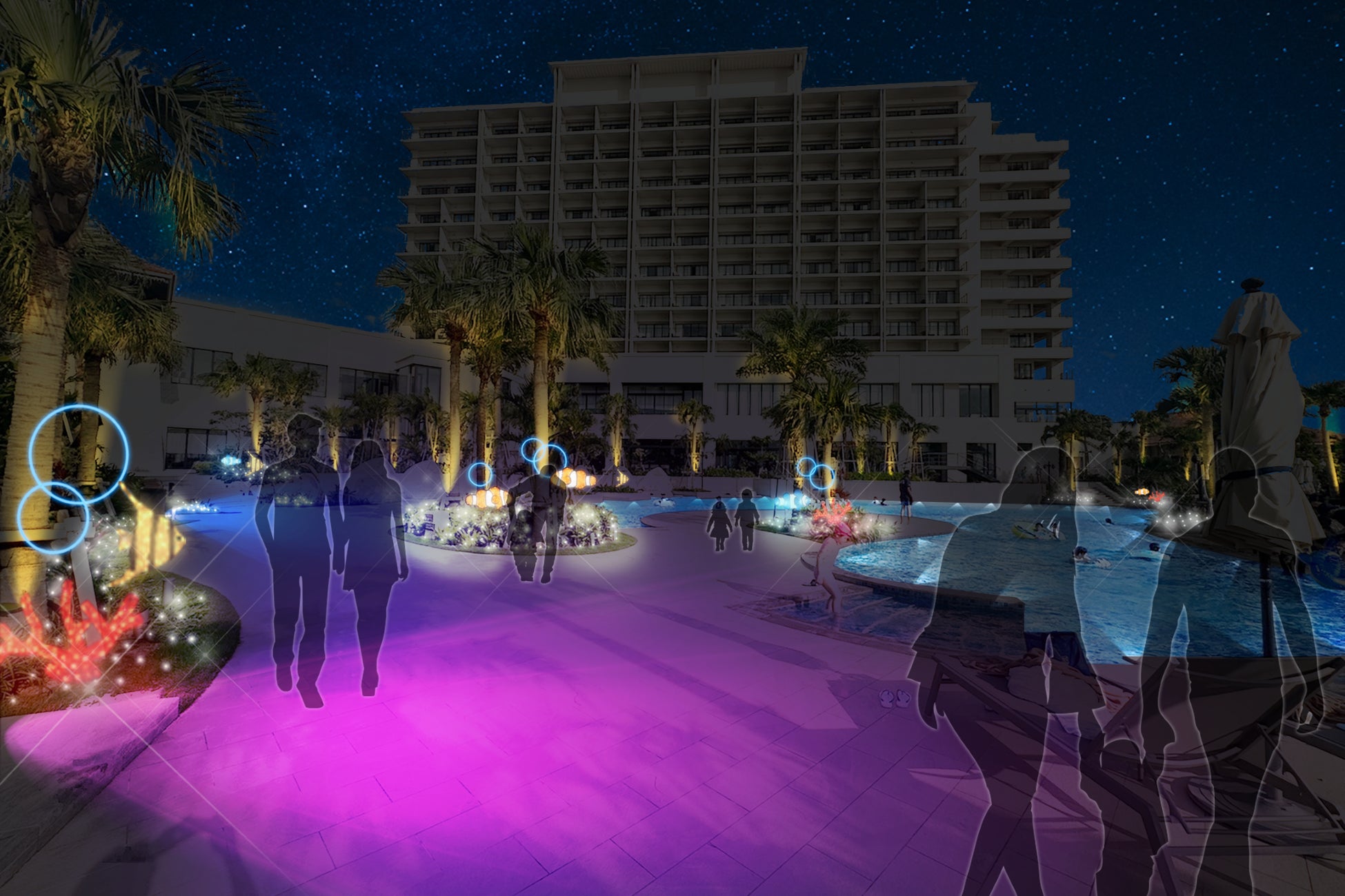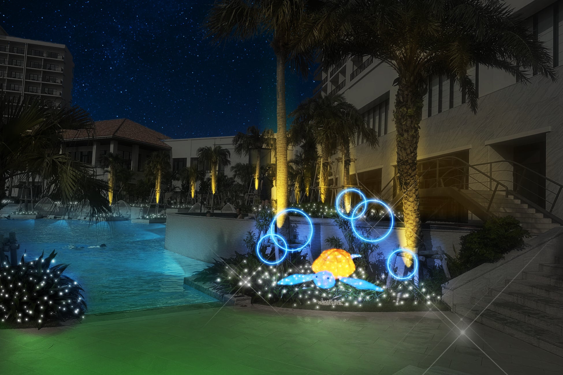 ホテルの開業2周年を記念した「月夜のワンダーイルミネーション」は、遊泳できない冬季期間でも沖縄での滞在を最大限楽しんでいただきたいという思いから考案した、イルミネーションイベントです。広大な敷地を利用し、約10,000平米のプールエリアと約4,000平米のメインエリアでイルミネーションが行われます。