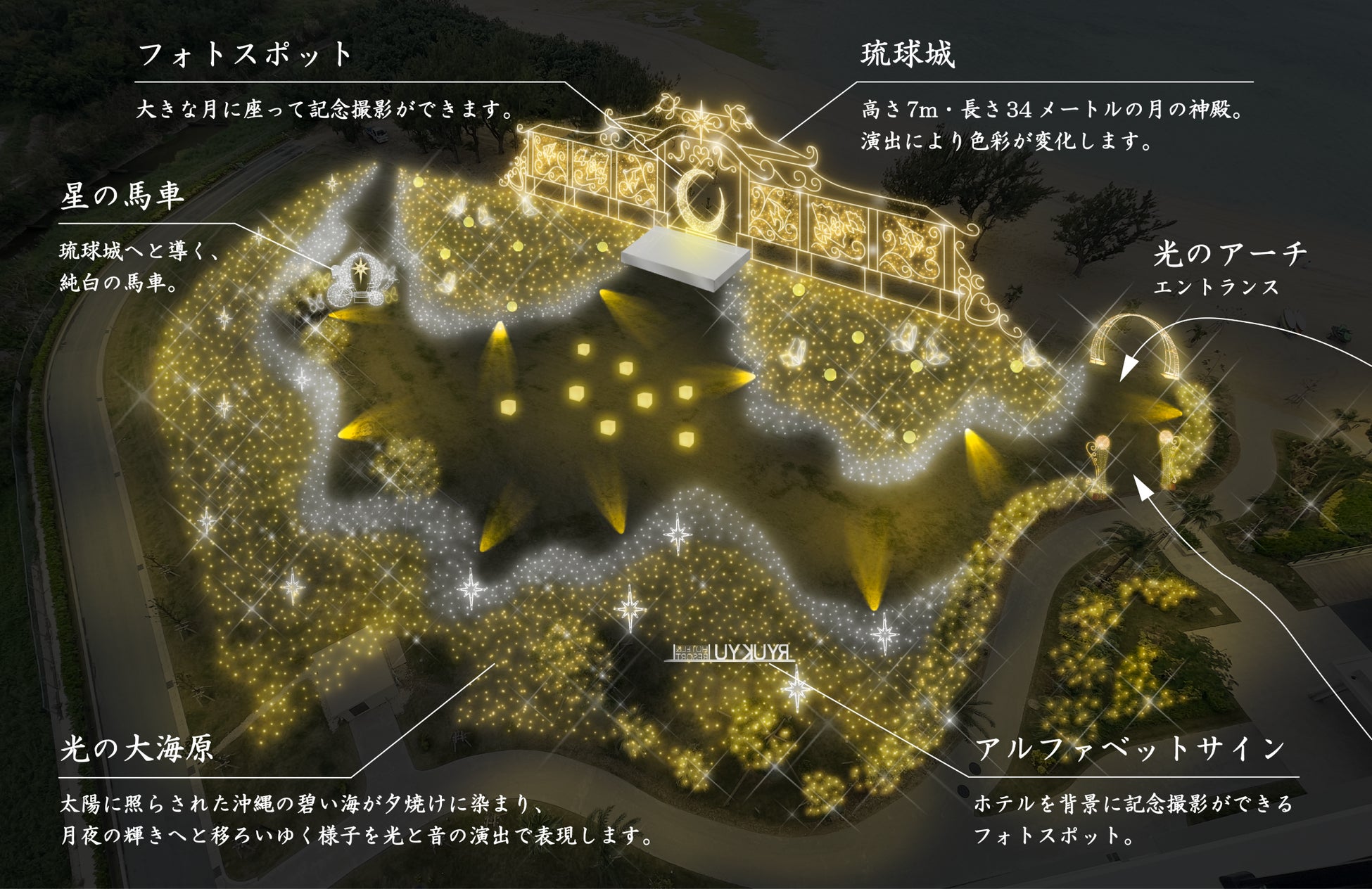 輝く月夜と光の海原を舞台に光と音のショーが繰り広げられ、ウミガメが産卵のために訪れる名城ビーチに広がる月の神殿「琉球城」が、来場者を幻想的な世界へと導きます。さらに、月夜と光の演出による没入感を体験できる多彩なスポットも設置いたします。イルミネーション開催期間中にはクリスマスなど季節のスペシャルイベントも予定しております。