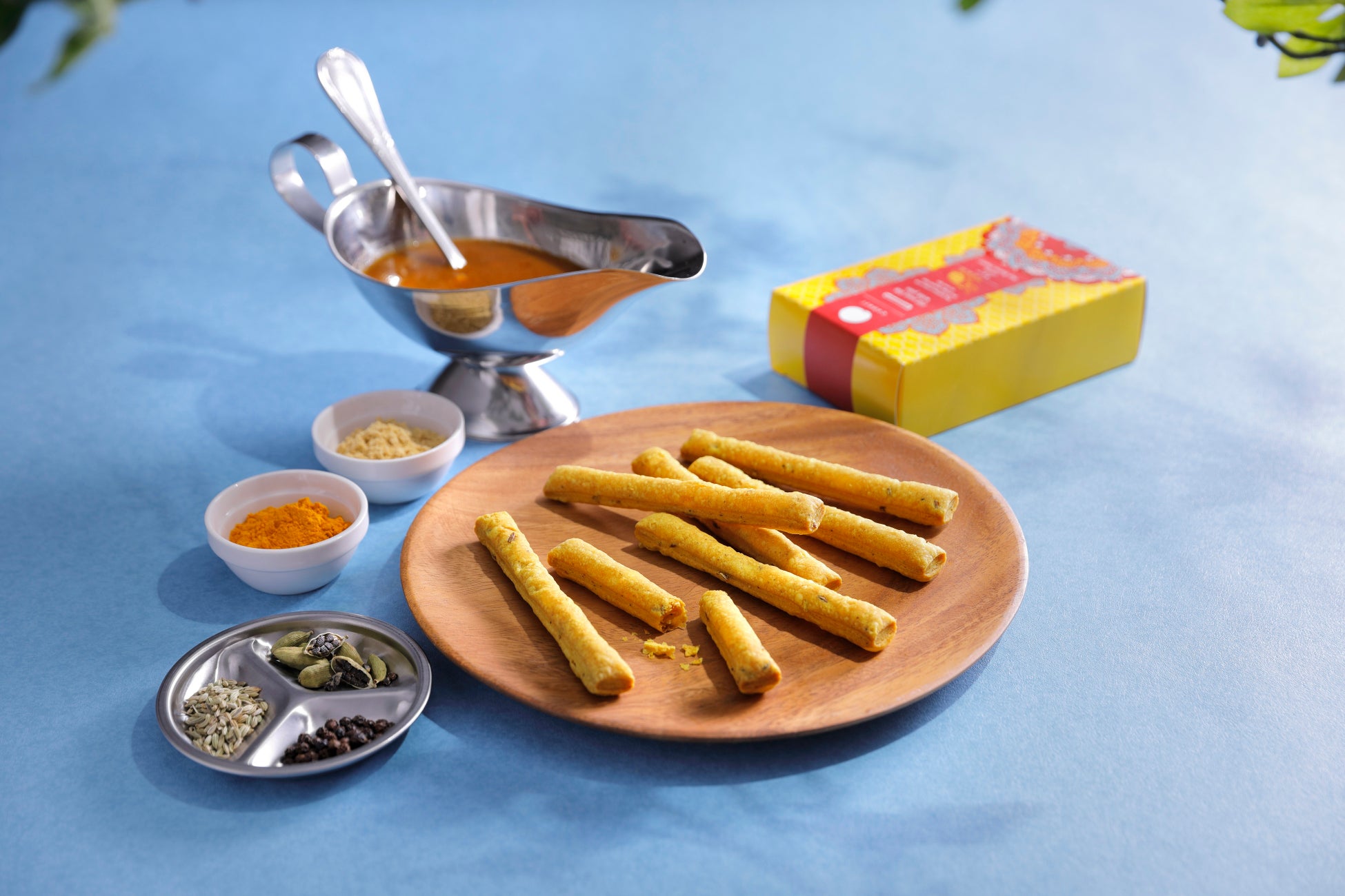 こだわりの配合・製法でスパイスを調合したオリジナルスパイスカレースティックパイです。インドの方にも楽しんでいただけるよう、こだわりの配合・製法で調合したスパイスをふんだんに使いながらもconeriならではの軽やかな食感のパイに仕上げました。パッケージはカレーの色合いをベースに、差し色にターコイズブルーを使って引き締めました。