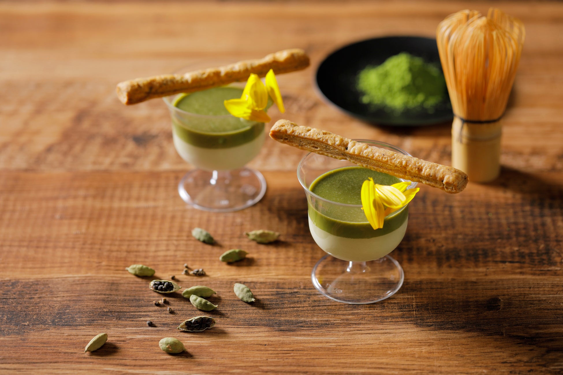 豆乳ホイップで仕立てたふわふわのムースのような掛川抹茶のミロワールの上に、抹茶の苦みを効かせたチャイガナッシュを重ねたマサラ香るディップです。パイにディップさせて食べるのはもちろん、軽い口当たりなので、そのままグラスデザートとしてもお召し上がりいただけます。