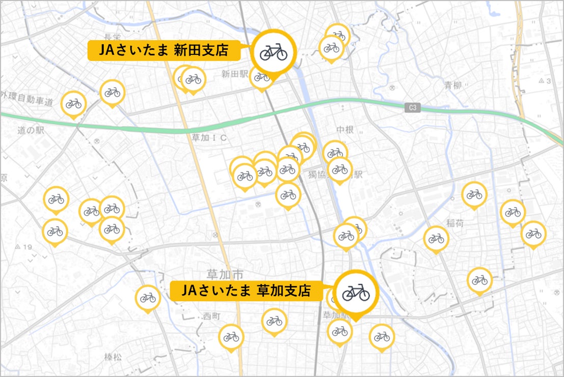 また、地域のニーズに応じた店舗資産の有効活用も積極的に行っており、このたび、草加市によるシェアサイクル実証実験に賛同されたことで、新田支店・草加支店の敷地の一部を提供いただき、「ダイチャリ」を導入する運びとなりました。両支店とも、東武伊勢崎線沿線に位置する駅近の立地に加え、支店の周辺には、既存の「HELLO CYCLING」ステーションも多く、組合員や地域住民の、交通手段の多様化による利便性の向上や地域活性化に寄与することが期待されます。