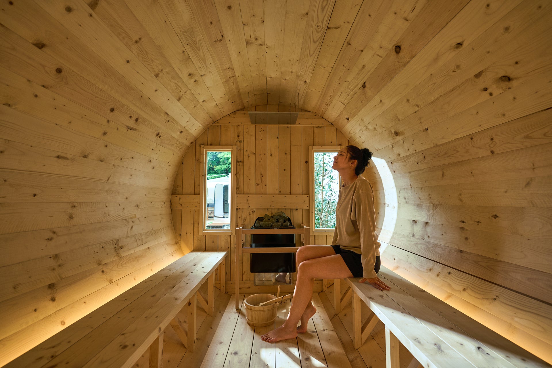 こだわりのバレルサウナで汗を流すと湖からの涼しい風が心地よく体を冷やす