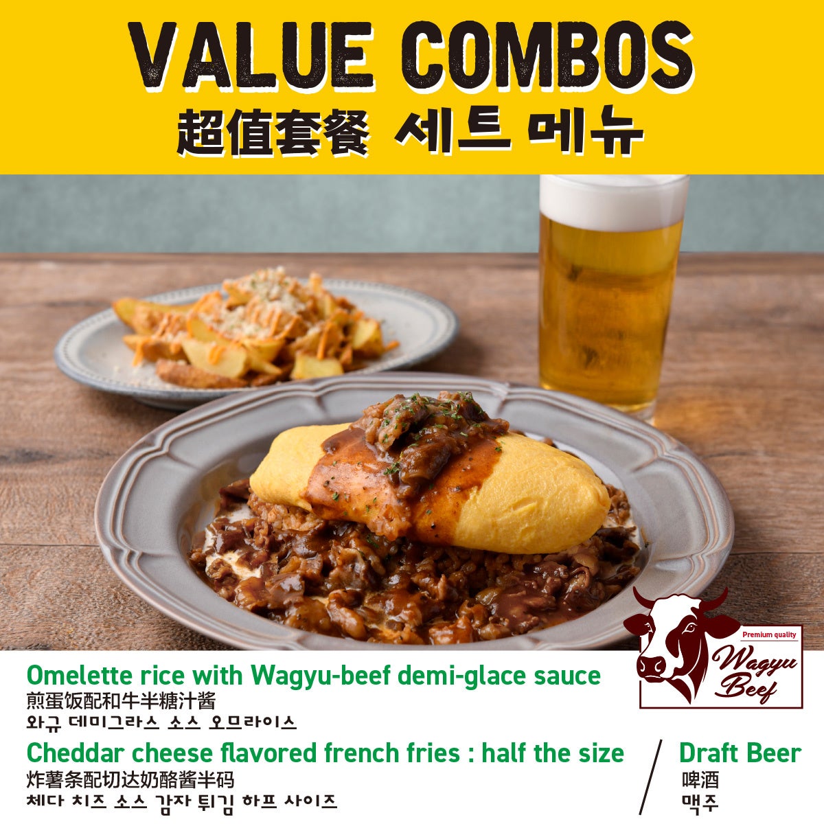 黒毛和牛デミグラスソースのオムライス+ハーフチェダーポテト+サッポロ黒ラベル