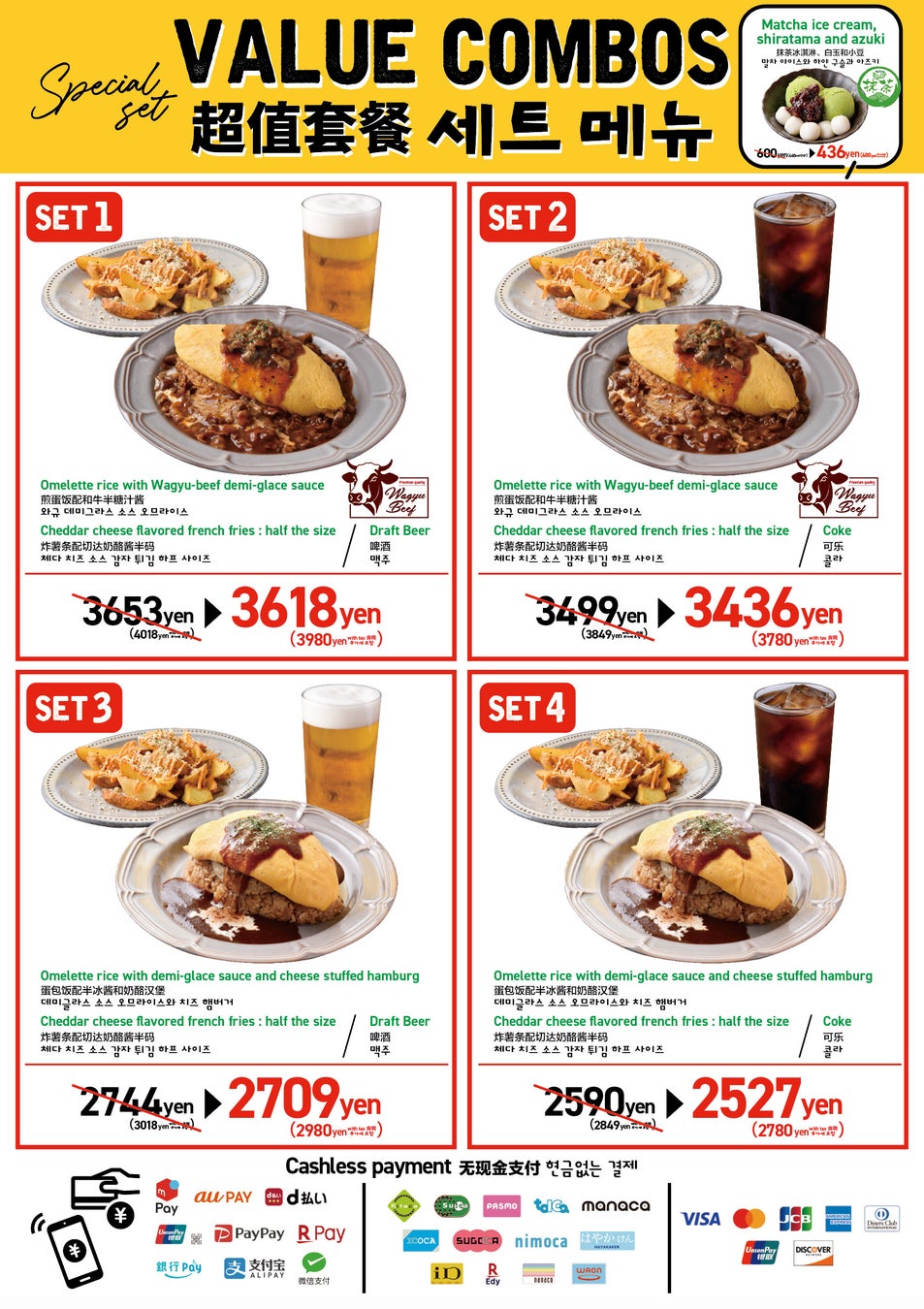 看板メニュー「デミグラスソースのオムライス」と新メニュー「黒毛和牛デミグラスソースのオムライスにポテトとドリンクがセットになった全4種。単品でご注文いただくよりお得に、ボリューム感あるおいしいセットとなっております!スイーツまで楽しみたい方には「抹茶白玉アイス ~あずき添え~」の追加メニューもおすすめです。