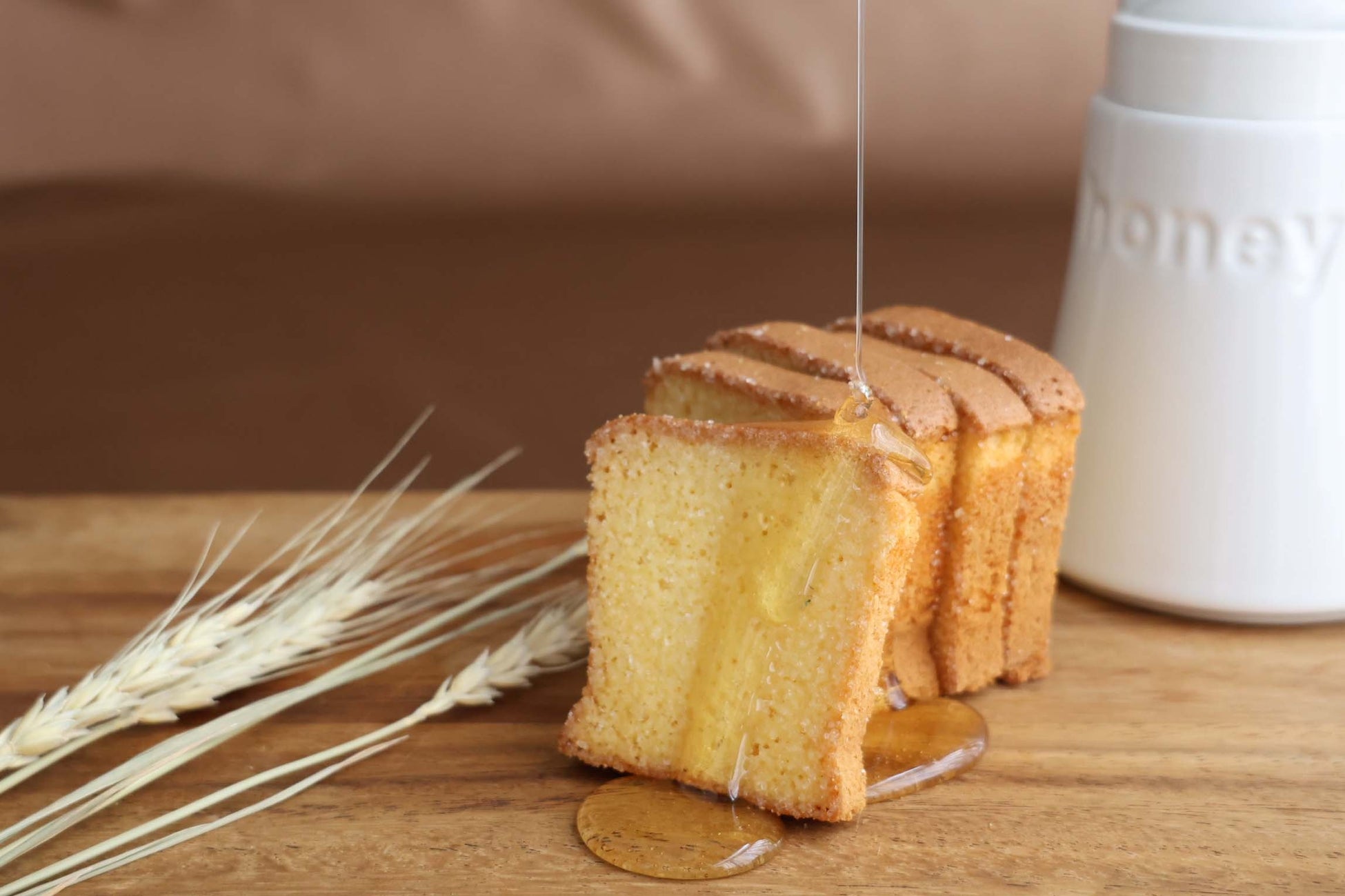 北海道産とうもろこしを練り込んだ生地で最初に本格的なコーンバターのパウンドケーキを焼き、そのままスライスしてラスクに仕⽴てていきます。さらに表⾯には、とうもろこしのパウダーをたっぷりと。てんさいの優しい⽢さとバターのこくとしょっぱさ、コーンの⾹ばしさが⼝の中いっぱいに広がります!