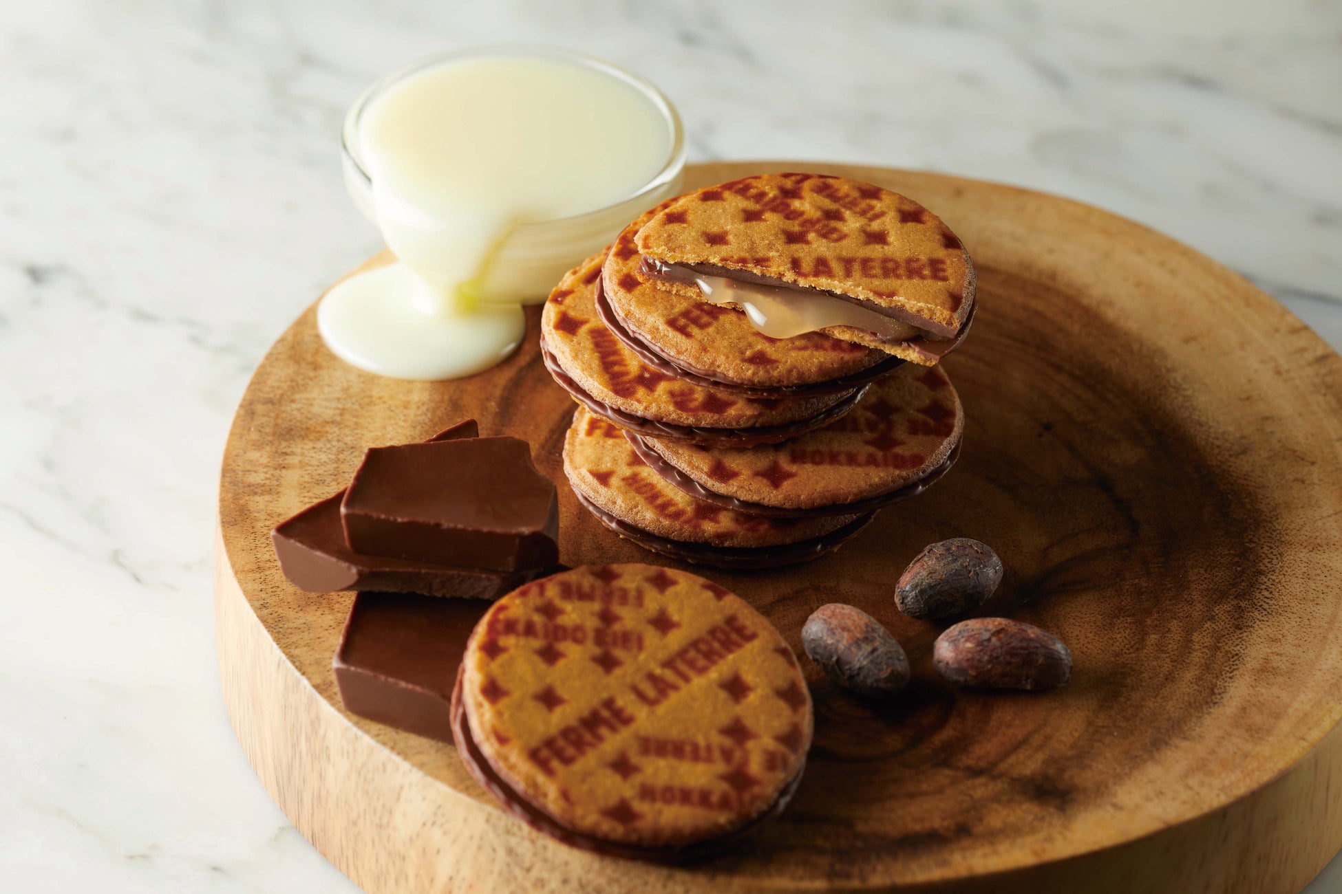 新千歳空港で今も大人気のミルクサンド。北海道美瑛産の小麦を使ったクッキーは、小麦自体の風味が感じられるシンプルなおいしさ。そこにチョコレートでコーティングされたどこか懐かしい味わいの練乳ミルクソースをサンド。 割ってみると、ミルクソースが「とろ~っと」とろけて、サクサクのクッキー、チョコレート、とろける練乳ミルクの3つのおいしさが合わさり、お口の中で広がります。