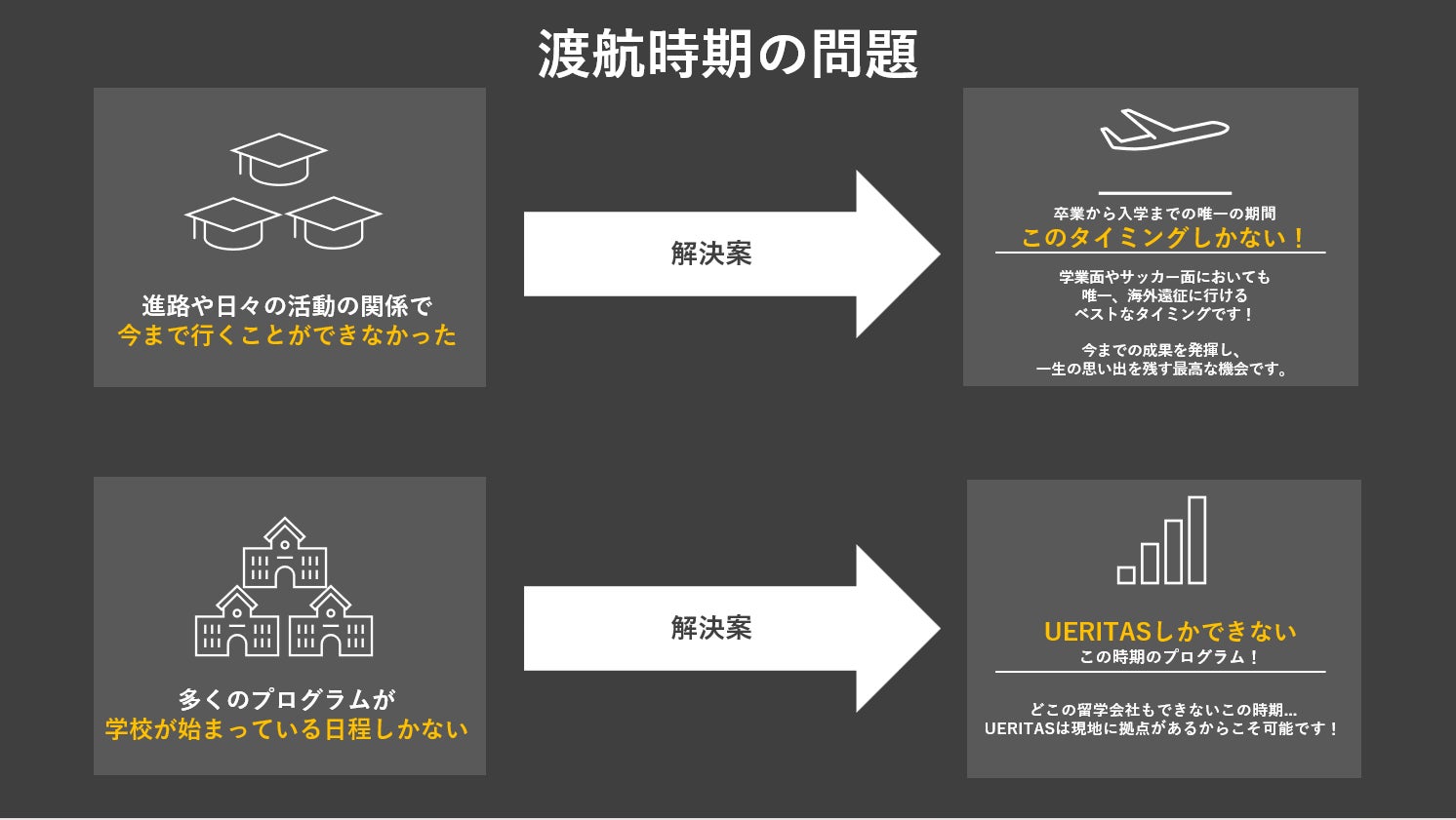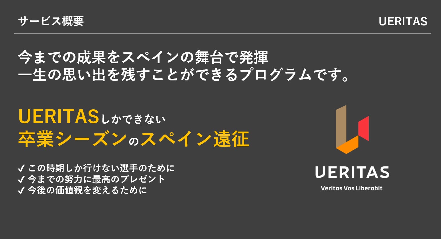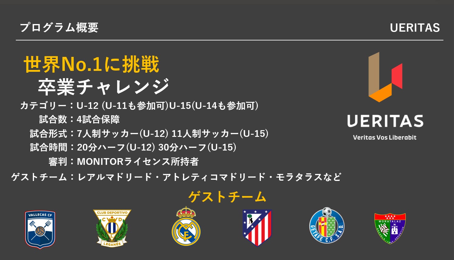 選手第一主義でチームやスクールを支援するスポーツ留学・遠征・企画を行う株式会社UERITAS(以下UERITAS)は小学生と中学生を卒業するサッカー選手や所属チームに向け卒業企画として海外遠征プログラム「卒業チャレンジ」を提供します。