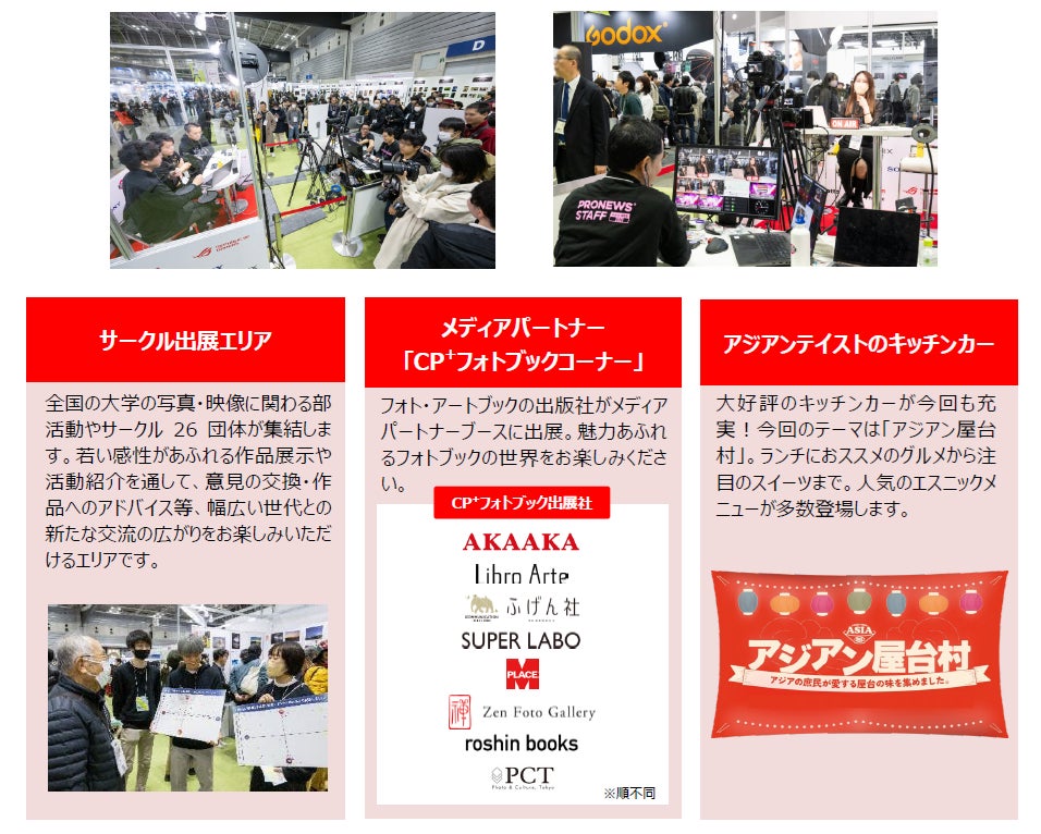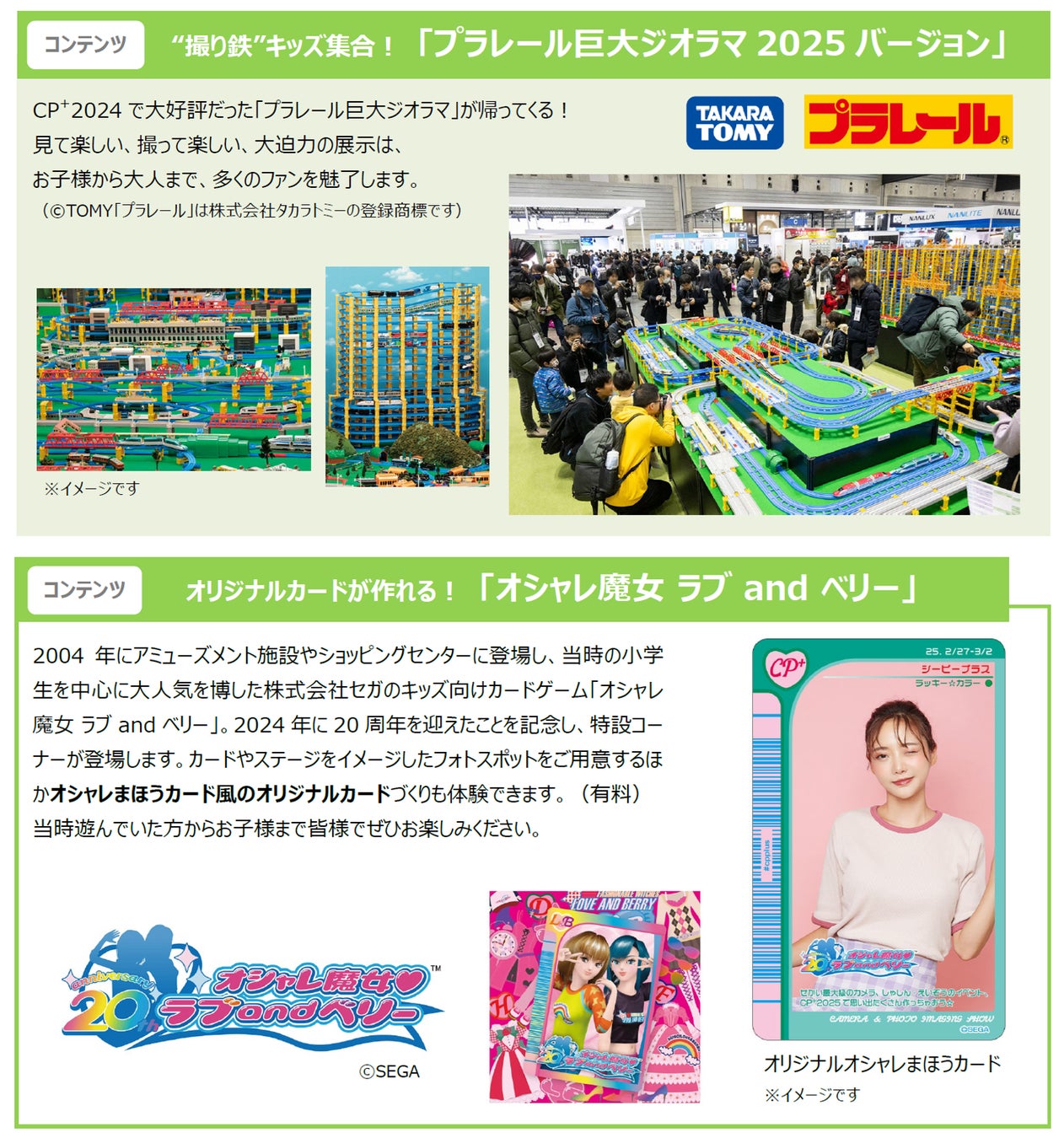 今回は「撮る」「見る」「つながる」をテーマに、各社の新製品展示をはじめ、写真家や映像クリエイターによる充実のステージイベント、多彩な写真展、SNS世代や若いファミリーに向けた写真・動画撮影のワークショップなどの企画イベントを取り揃えています。ファミリーに大好評のプラレール巨大ジオラマ、若い女性に人気の「オシャレ魔女 ラブ and ベリー」コーナー、会場の熱気を伝えるライブ配信に加え、SNSで情報発信していただくCP⁺公式アンバサダーも募集します。また、お子様のために可愛いカメラ型バッジホルダーが貰えるキッズ入場証や、学校向けの団体入場登録などもご用意しました。キッチンカーのグルメ企画もアジア系グルメをテーマにさらに充実します。