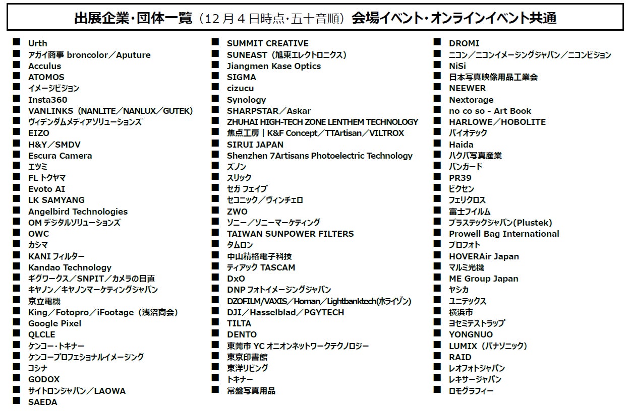 - 主な出展分野:カメラ、レンズ、フォト・ビデオアクセサリー、プリンター、画像・動画編集ソフト、ディスプレイ、プロジェクター、フォトブック、プリントペーパー、スタジオ用品・機材、ドローン、ウェアラブルカメラ、SNS などのサービス、スマホ関連機器・サービス、双眼鏡・望遠鏡など