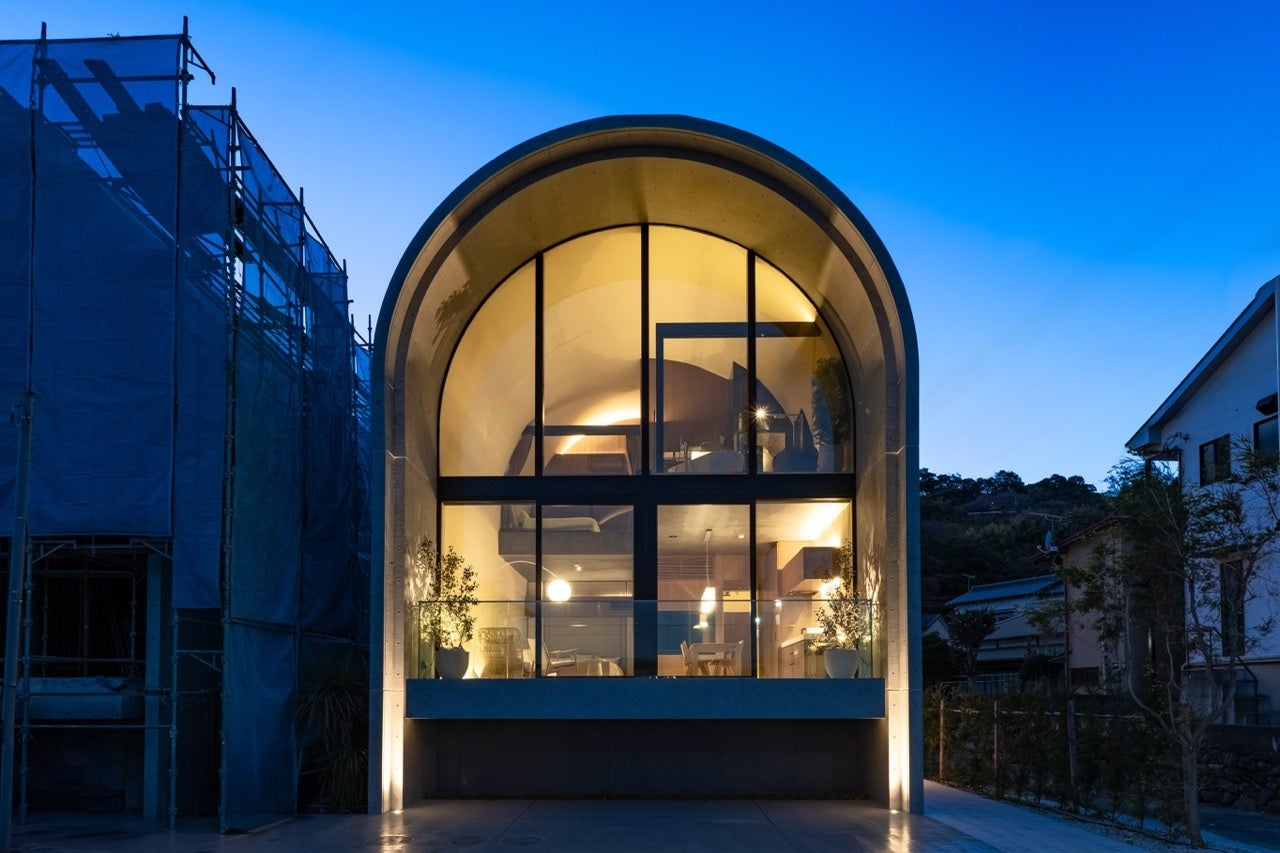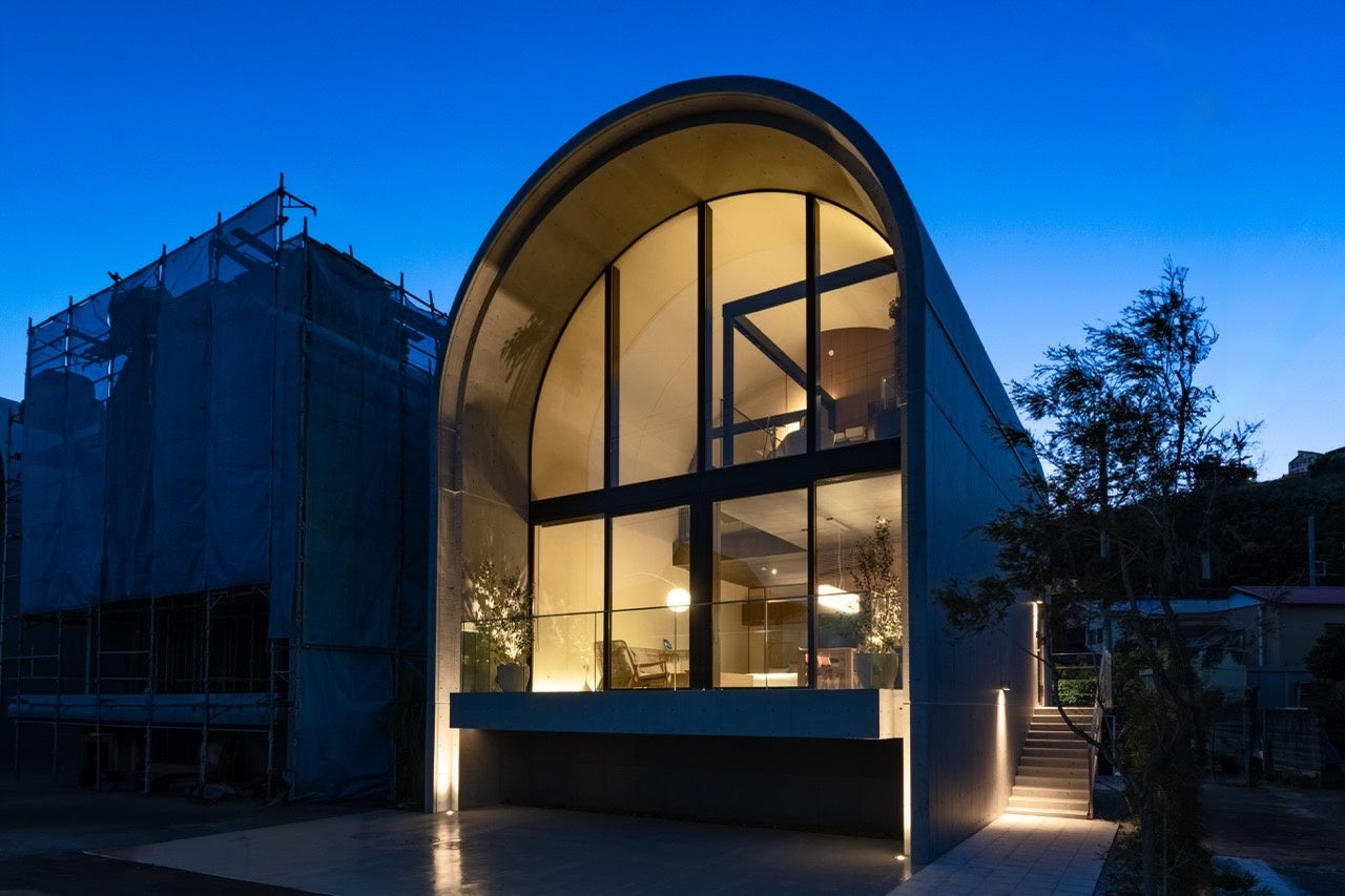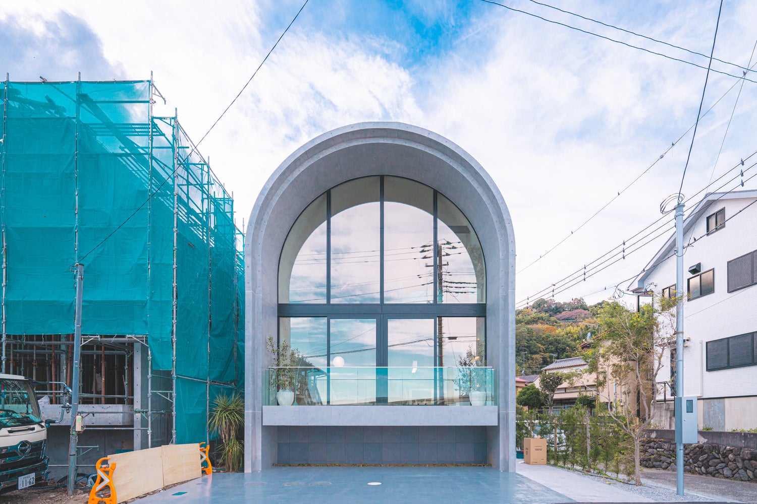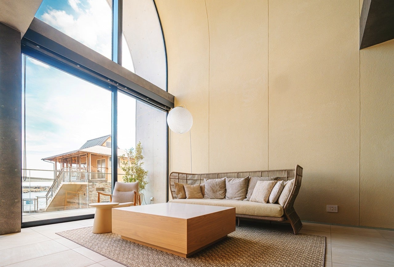 「WITH SEAのフラッグシップとして、象徴的な存在感を持つ建築を目指しました。屋根には、シンプルながら特徴的なボールト形状を採用。外壁は、真鶴の岩海岸や街並みとの調和を大切にし、コンクリート打ち放しの落ち着いたグレー色で仕上げています。内部は、ボールド屋根がもたらす柔らかい空間をさらに暖かみのあるものにするため、アイボリーの左官仕上げを選定しました。」