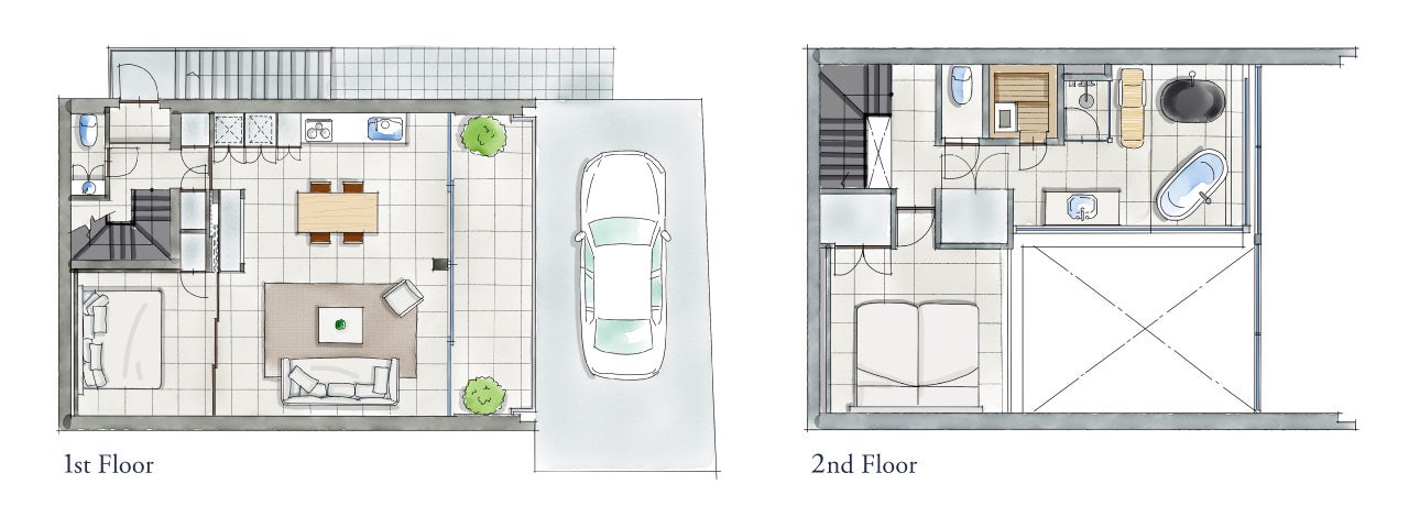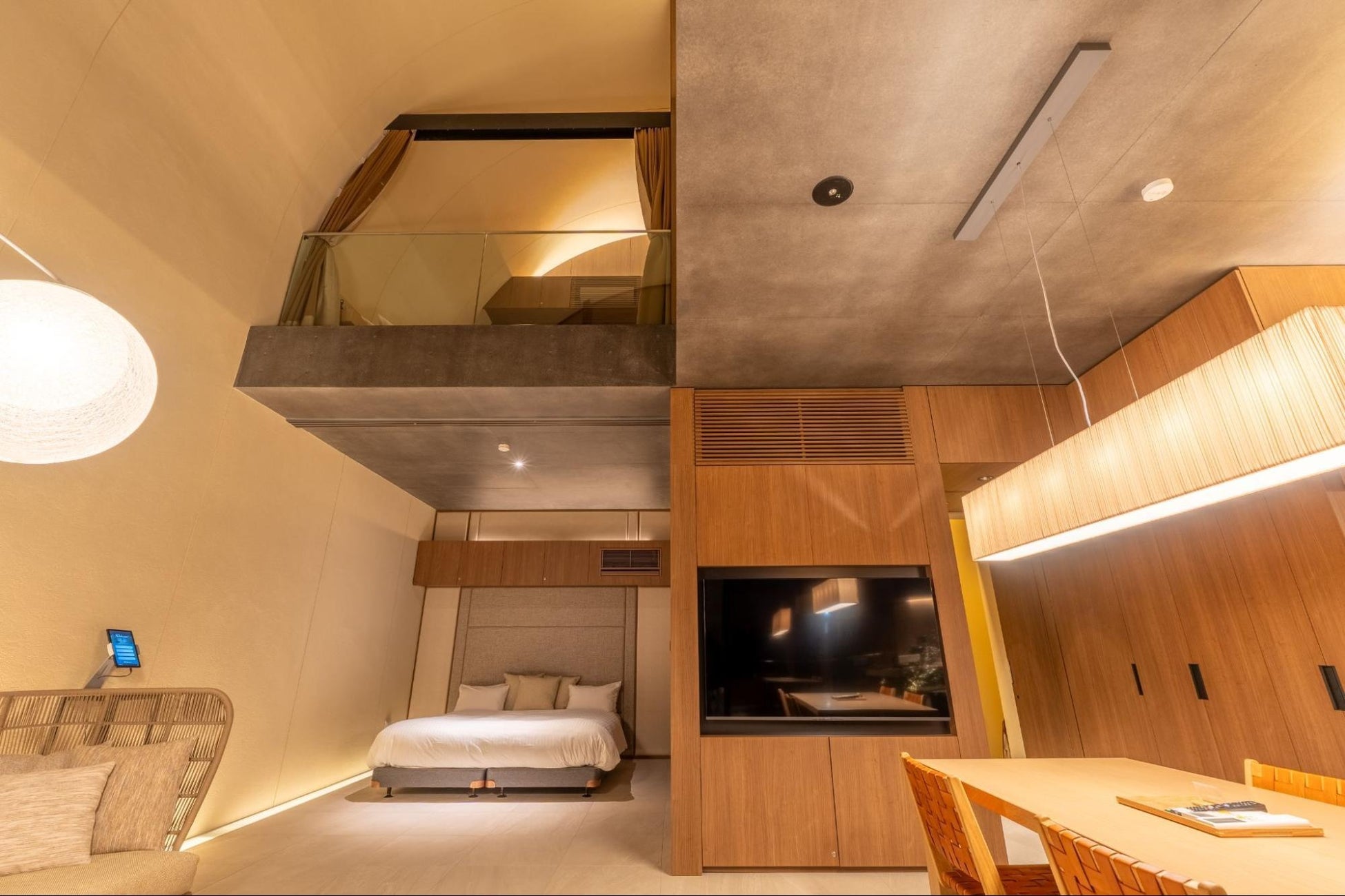 リビングルームには吹き抜けが設けられており、2階に位置するベッドルームやバスルームと調和し、すべての空間が一体感を持つ設計となっています。内装・インテリア・照明・アメニティに至るまで、細部にこだわり抜いたセレクト。洗練されたデザインでありながら、居心地の良さを兼ね備えた空間が広がります。
