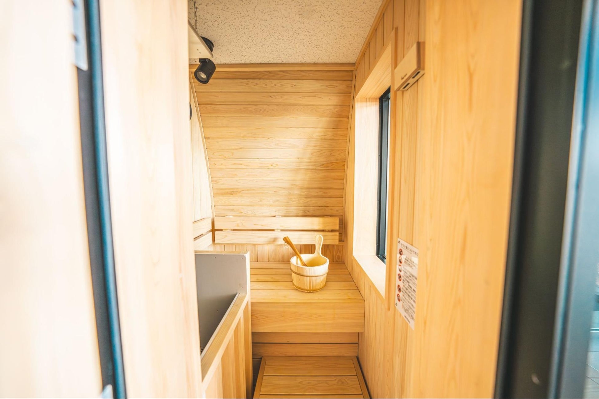 吹き抜け上部にはサウナとバスルーム。まるで宙に浮いているかのような感覚を味わうことができます。