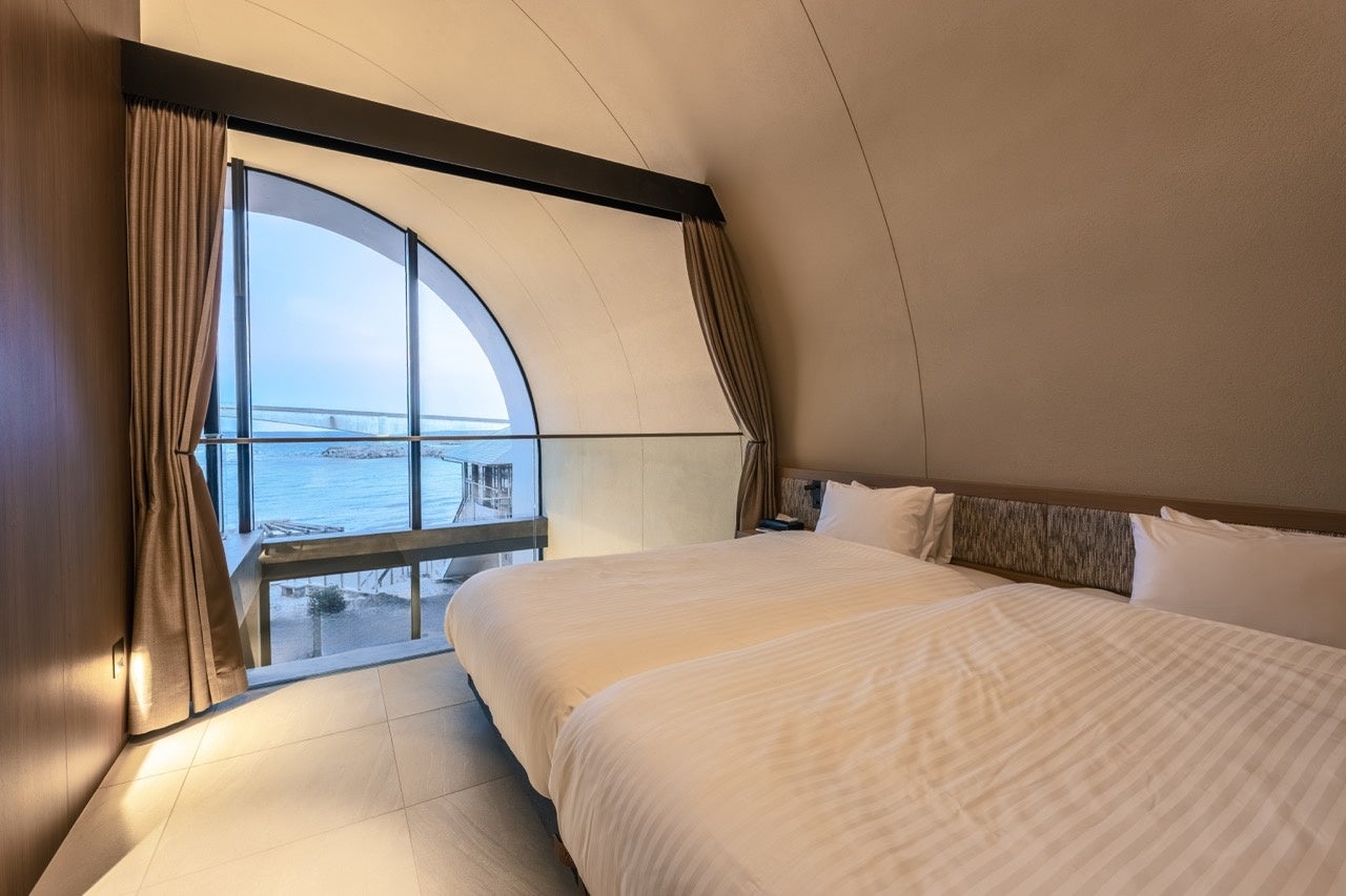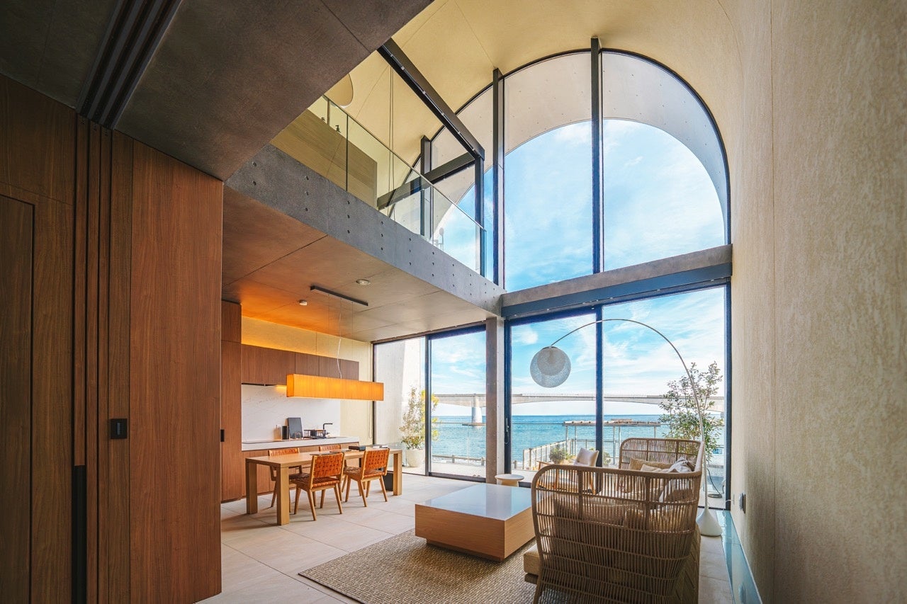 「ボールト屋根が生み出す最大7.5メートルの大空間は、全ての居室から常に海を眺められるように設計されています。非日常を感じられるこの空間は、訪れる人々に特別な時間を提供します。家具は施設の雰囲気に合わせオーダーメイドで製作しこだわっています。デザイン性と機能性を兼ね備えた家具は、ホテルならではの快適さとくつろぎを実現します。真鶴岩海岸の新たなランドマークとして、真鶴町を活気つける建物となってくれることを期待しております。」