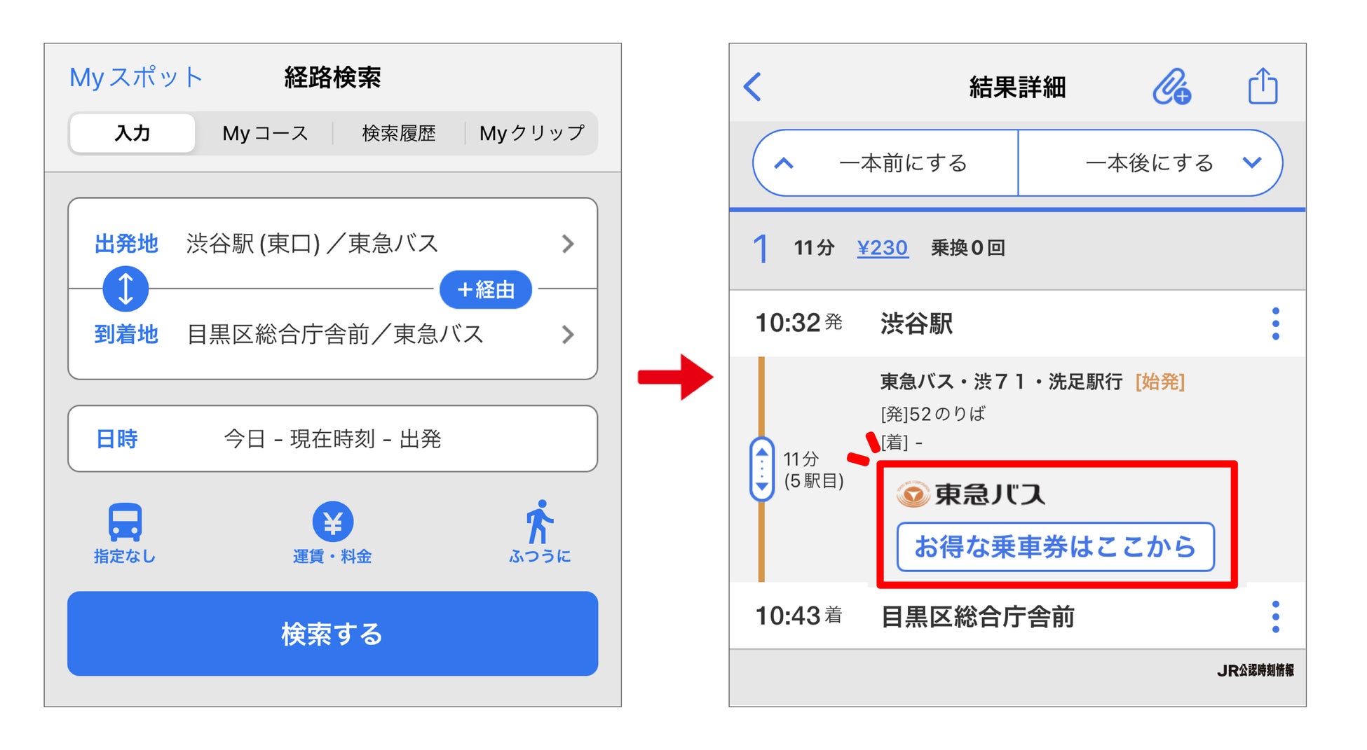 これにより、「駅すぱあとアプリ」の経路検索結果にて東急バスの運行系統区間では、東急バスのお得な乗車券をお知らせするリンクが表示されるようになった。