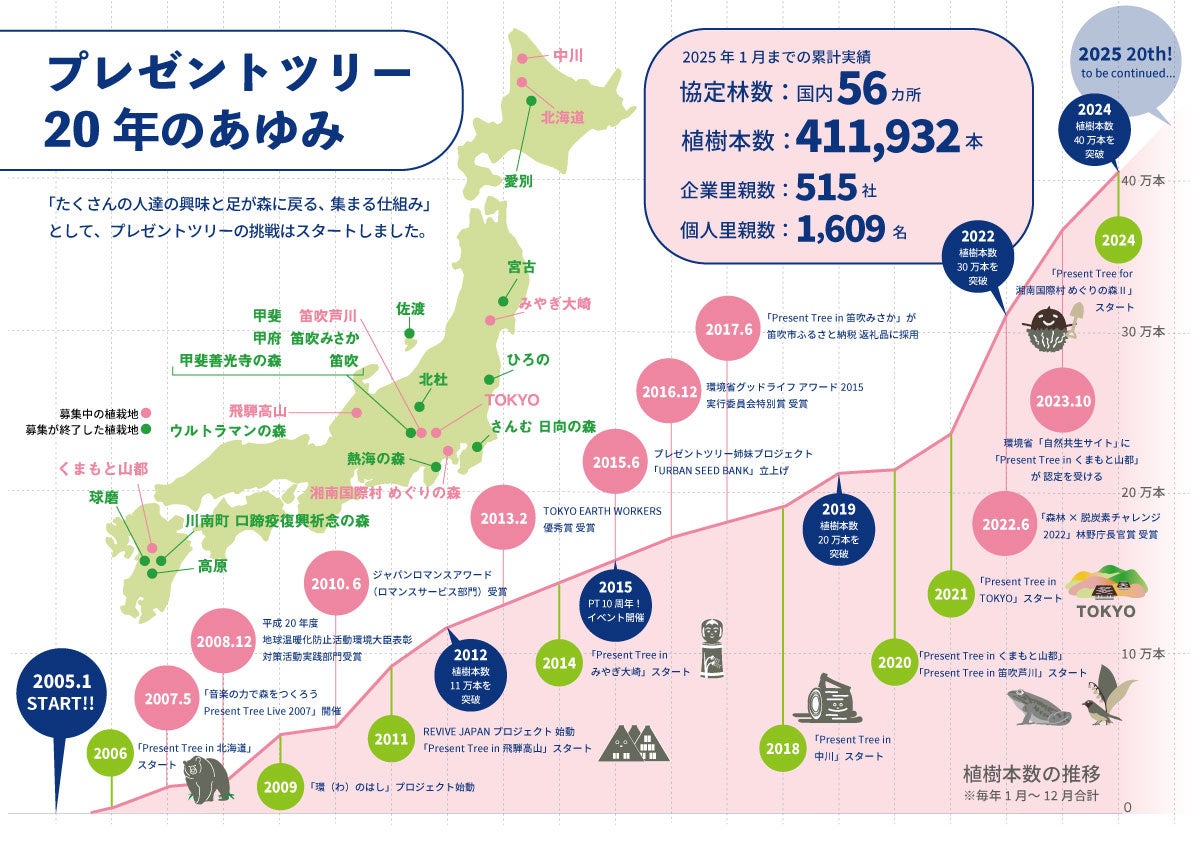 認定NPO法人環境リレーションズ研究所(東京都千代田区、理事長:鈴木敦子)が運営する、森林再生と地域振興の同時実現を目指すプロジェクト「プレゼントツリー」が、2025年1月30日に20周年を迎えます。