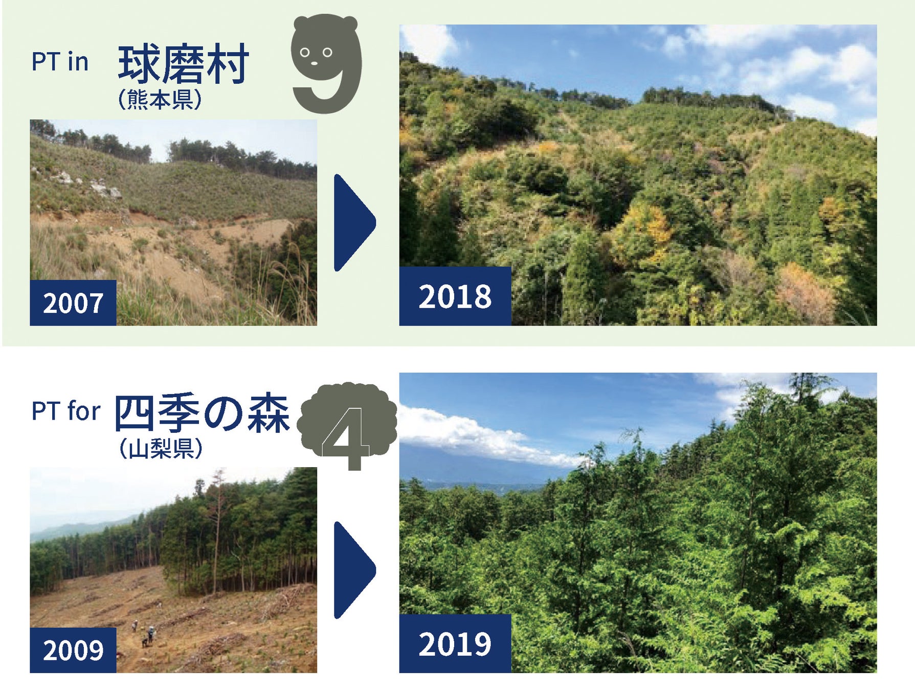 こうしてプレゼントツリーは、20年間で、全国56カ所・海外2カ所にて森林再生と地域振興に寄与してまいりました。協定期間の10年間を経た多くの森で、着実に森林の再生が行われています。