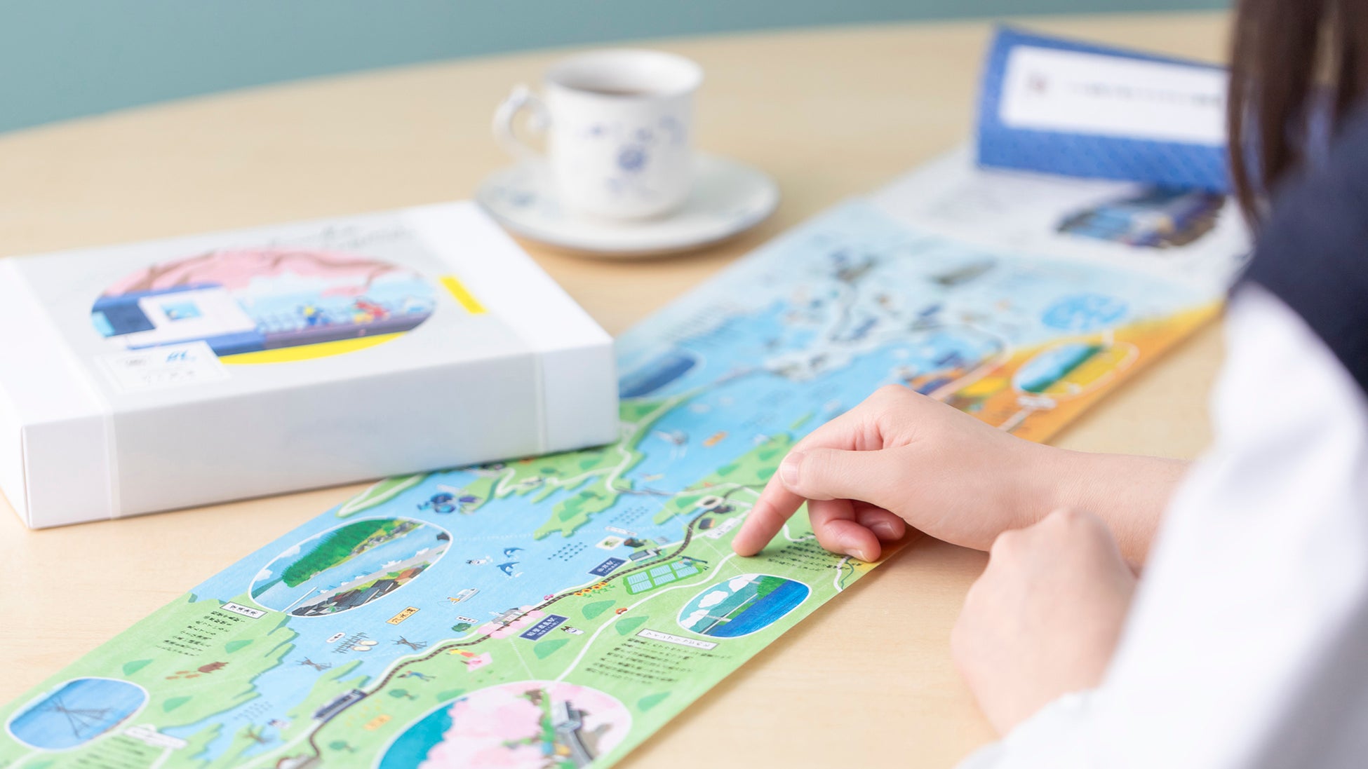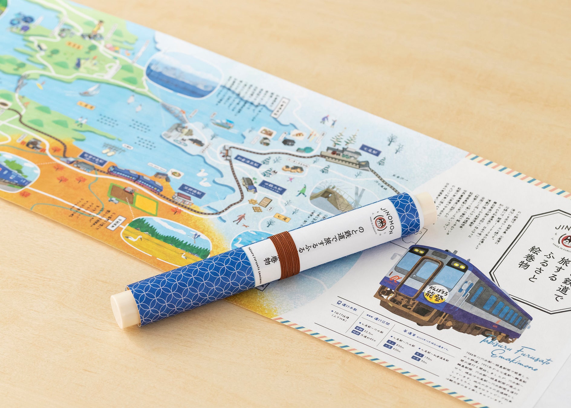 全長約1メートルの巻物型。のと鉄道の沿線をイラストマップとして描きながら、周辺のおすすめスポットや自然文化についても説明しています。イラストには能登在住のイラストレーターを起用。