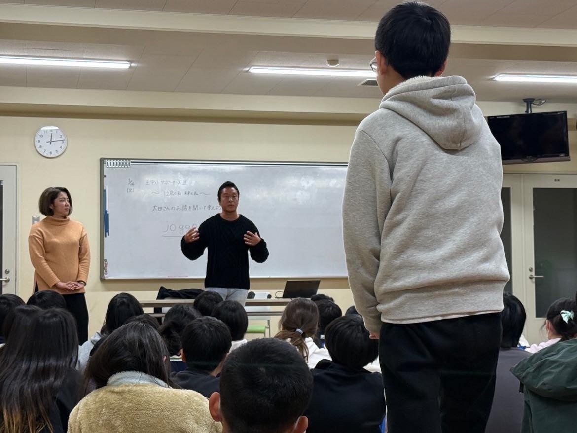 また、講師の太田さんと野上さんからジョッゴで働くに至った経緯や理由を生徒達に伝えしました。野上さんは自身がキャリアを選択する上で歩んできた道を振り返り、ジョッゴのミッションである「誇りの持てる仕事の選択肢を全ての人へ」を現在の仕事を通じて取り組んでいきたいこと、太田さんは、生徒達に向けて将来の仕事を考える際に、自分の志を大切にしてほしいこと、仕事を通じて誰かを幸せにできるような仕事に就いて欲しいことなどを生徒たちにお話ししました。