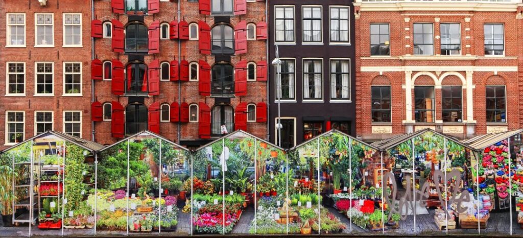 アムステルダム中心部にあるシンゲルの花市は、色鮮やかなチューリップや季節の花々が並ぶ観光スポットです。運河沿いに広がる露店では、切り花や球根、オランダならではの土産物も購入できます。