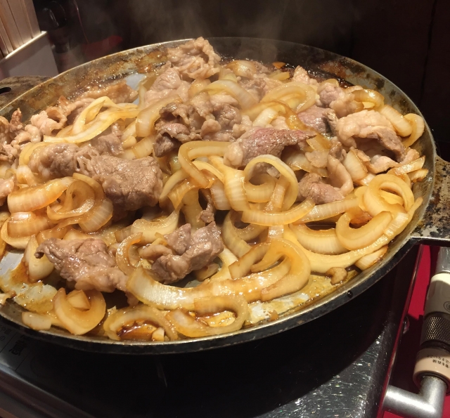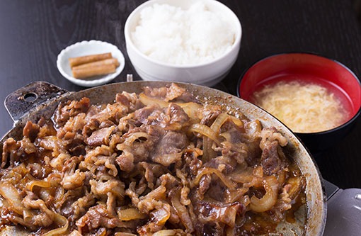 鉄板で玉ねぎを先に焼き、その上に牛バラ肉をのせて焼き上げます。玉ねぎの甘みと牛肉の旨味に甘辛いしょうゆベースのタレが絶妙に絡み合い、ご飯との相性も抜群です。