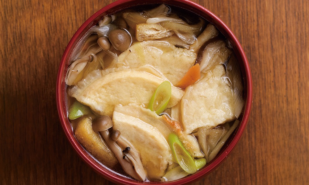鶏出汁や昆布出汁をベースに、ネギ・ごぼう・人参・きのこなどの野菜や鶏肉、板麩、凍み豆腐などを煮込んだ汁に、具の入っていない硬めの「南部煎餅」を割り入れて仕上げます。