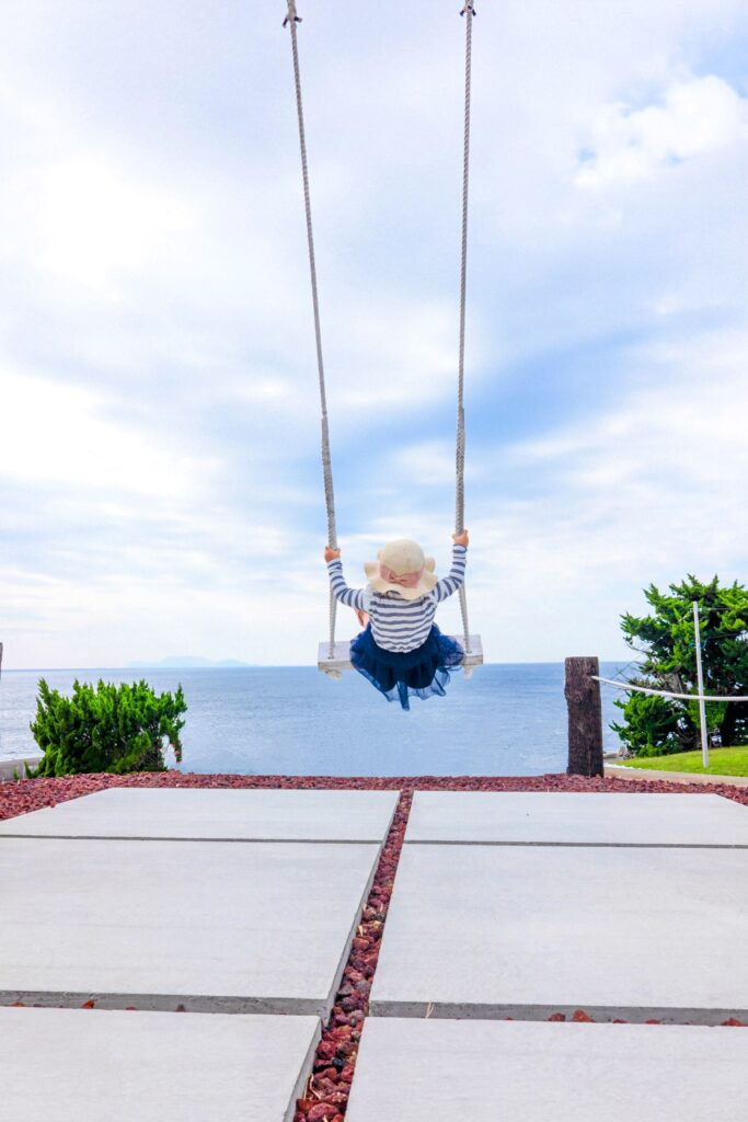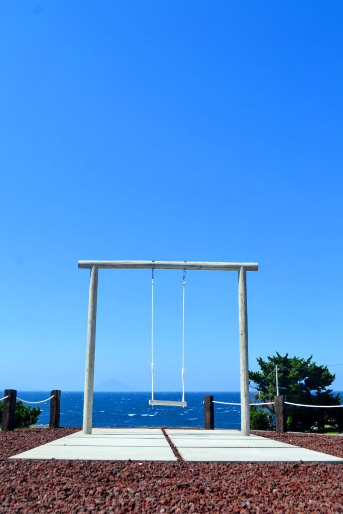 春は、鮮やかな新緑と透き通る青空が広がる、爽やかな季節です。ブランコ越しに見える青い空と海のコントラストが美しく、まるで絵画のような景色に包まれます。