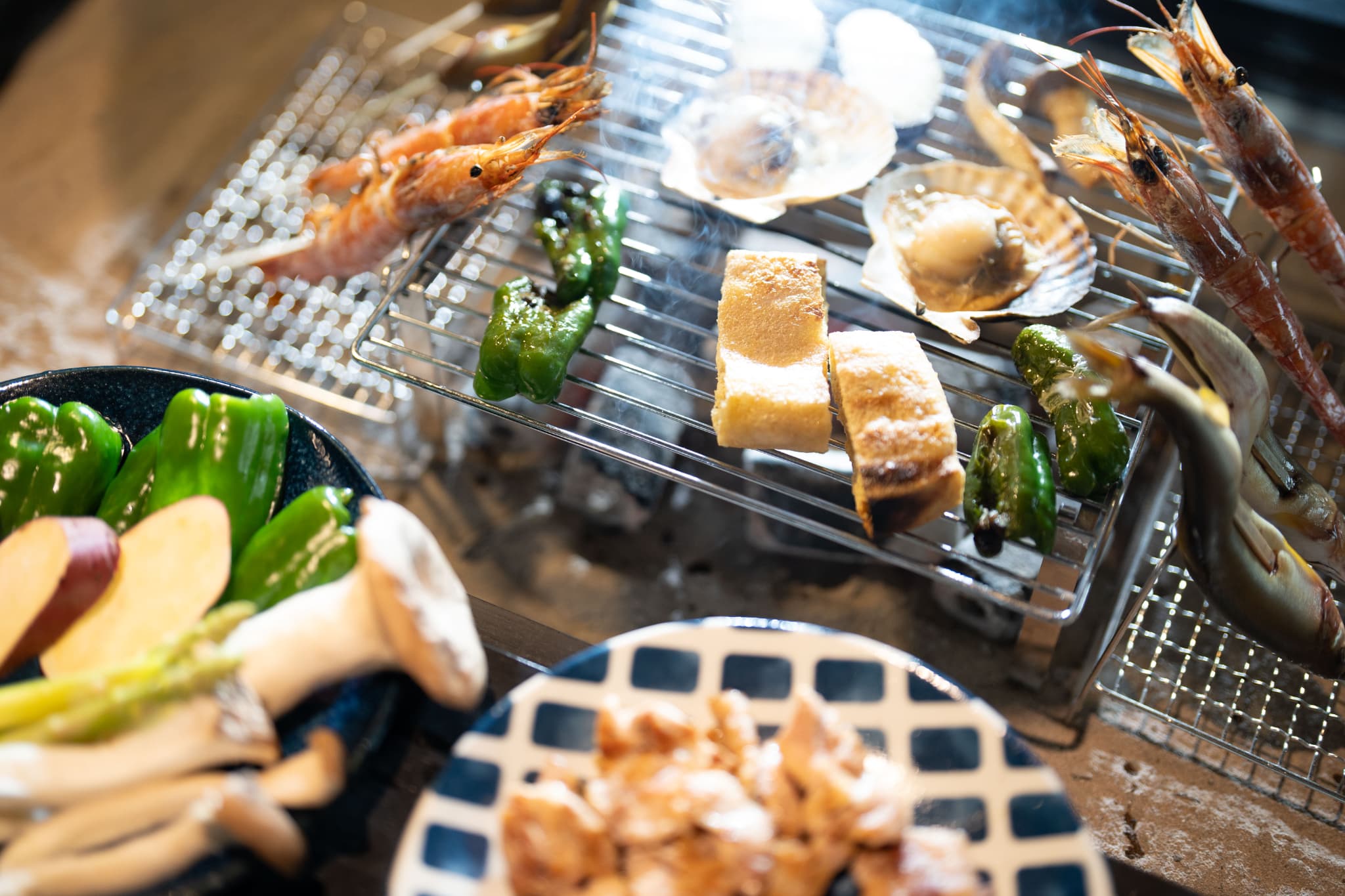 囲炉裏を囲みながら味わう夕食では、地産の味噌・糀しょうゆを使った鮎・赤海老・鶏肉の串焼きや、旬野菜、つくね鍋など五感で楽しむメニューが提供されます。