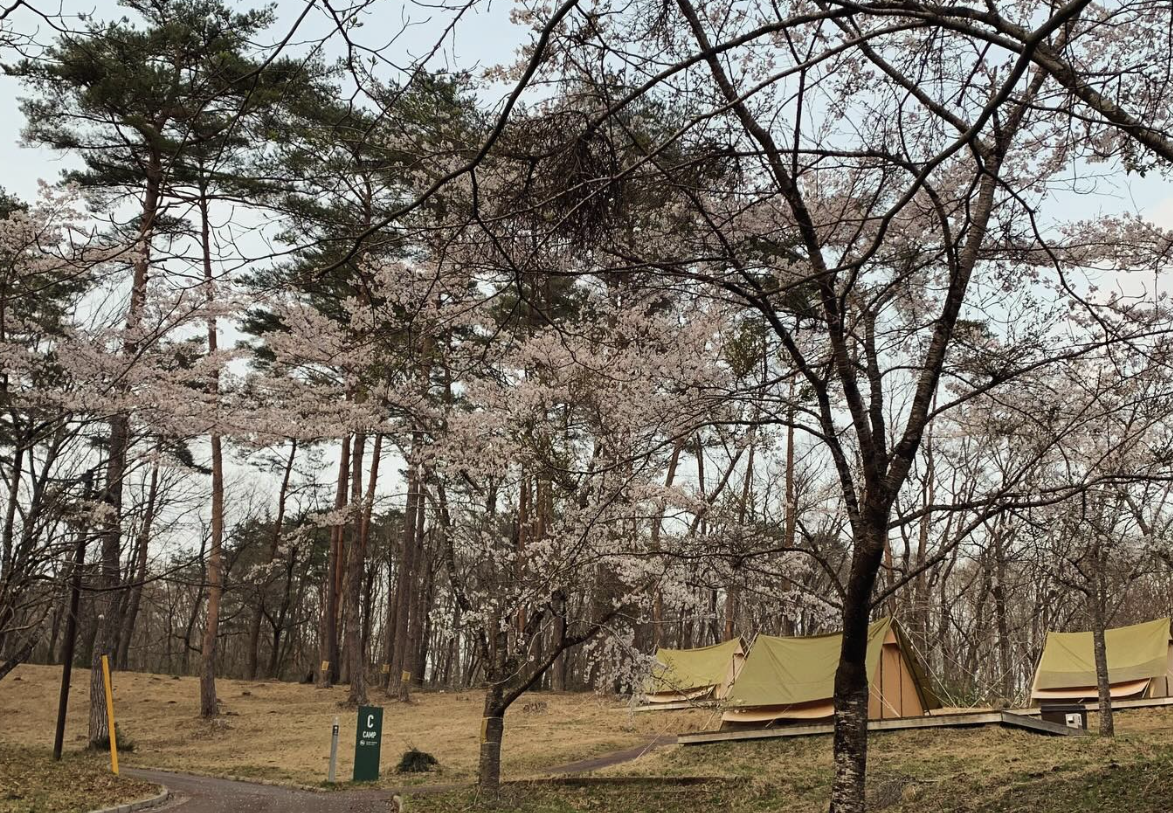 場内では、サイト内のあちこちで桜が満開となり、春の陽気がいっぱいに広がります。桜を優雅に花見グランピングを楽しめるのはこの時期だけの特権です。そしてフリーキャンプでは、桜の木の下にテントを設営するという贅沢な時間を味わう事もできます。