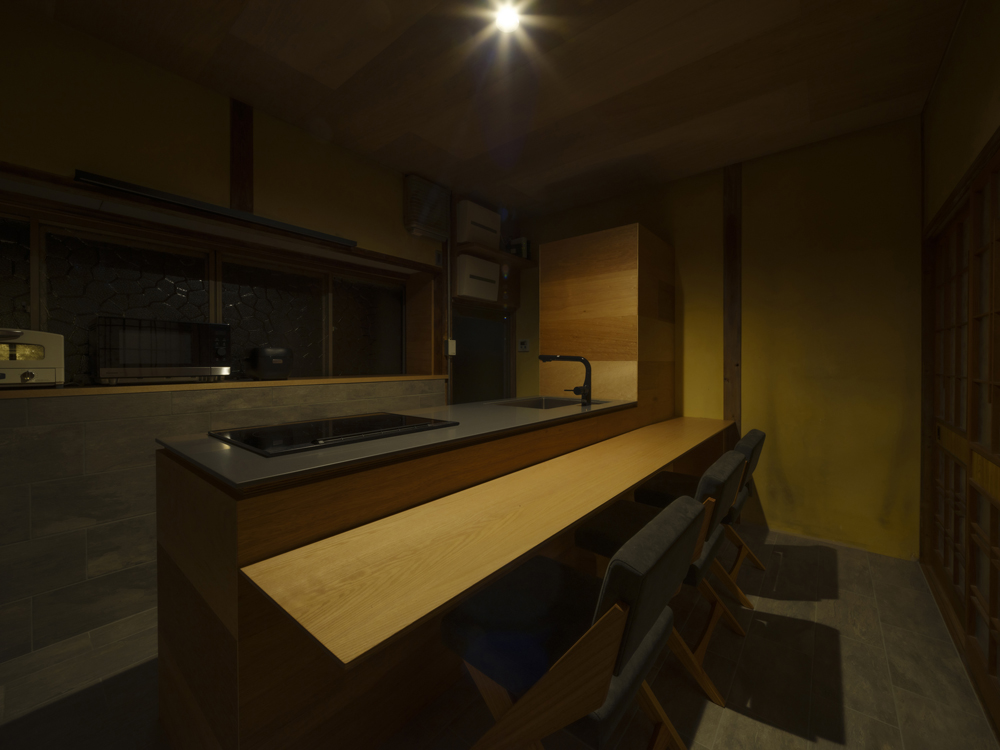 夕食は備え付けのキッチンカウンターを利用します。食事の提供はありませんが、食器、調理器具の用意があるので、好きなものを好きなだけ調理して味わえます。