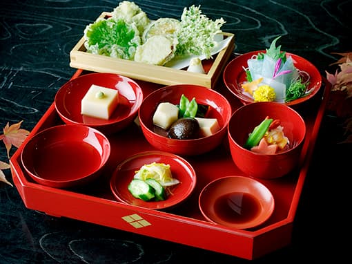 食材には季節ごとに山梨県ならではの地元食材も組み込まれることがあり、地場産の野菜や山菜が食卓に並ぶことも。仕入れ状況や時期により内容は異なりますが、旬の素材を大切にする精進料理ならではの味わいが魅力です。