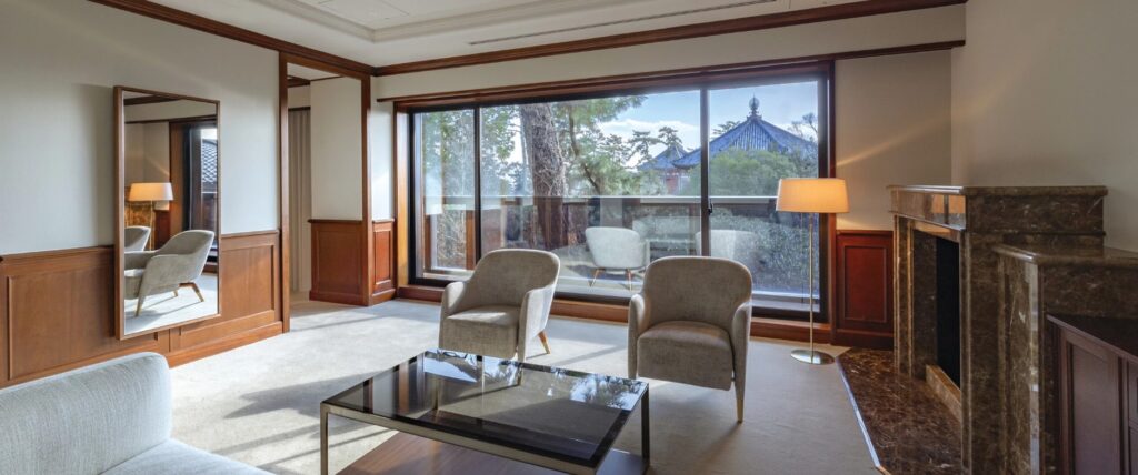 ホテル内は和風を取り入れたラグジュアリーな空間で、客室は庭園や古都の景観を楽しめるでしょう。レストランでは奈良の旬食材を活かした料理を楽しめます。