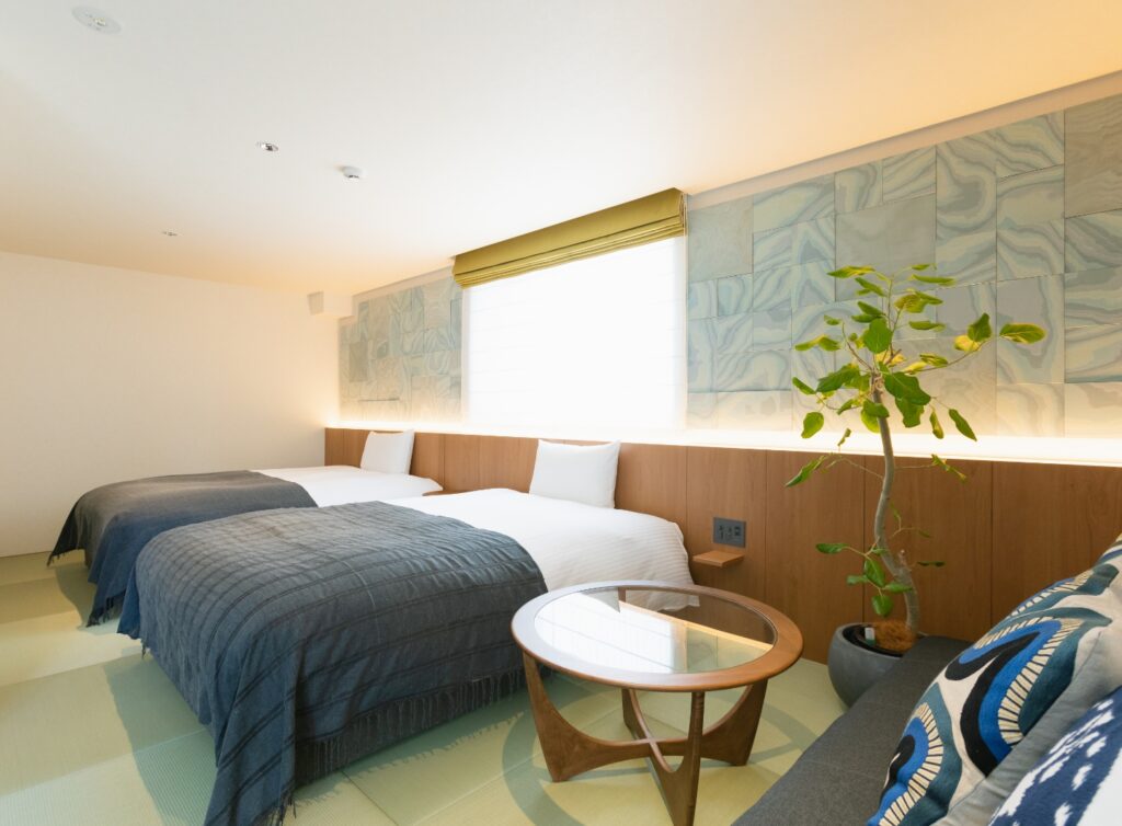 館内は瀬戸内の海色やデニムを思わせる落ち着いたデザインで、客室も幅広いタイプをそろえています。隣接する温泉施設「たまの湯」を滞在中に何度でも利用できるのもうれしい点です。