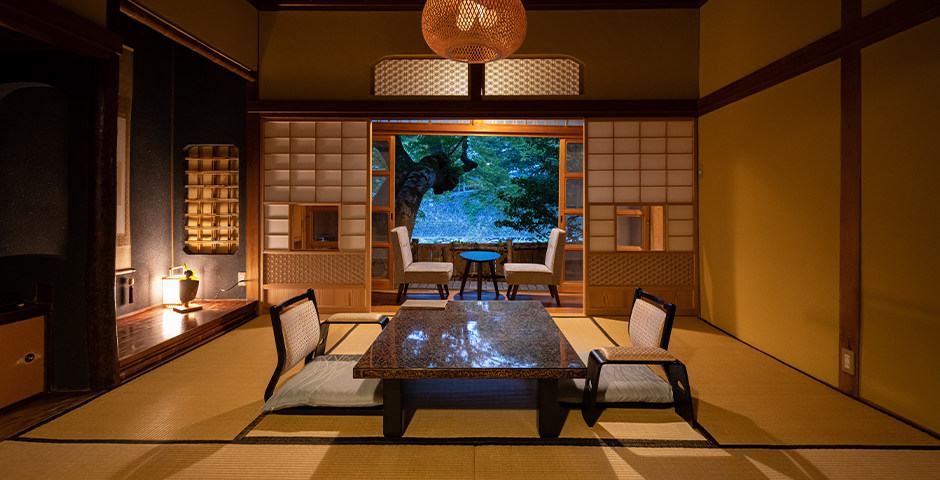 夜になると水面に灯りが映り、歩くだけで心がほどけるような雰囲気に包まれます。館内は蔵を活かした空間や落ち着いた和室が中心で、静かに過ごしたい人に合うしつらえです。