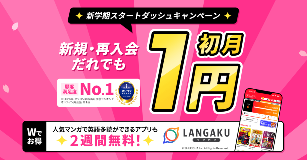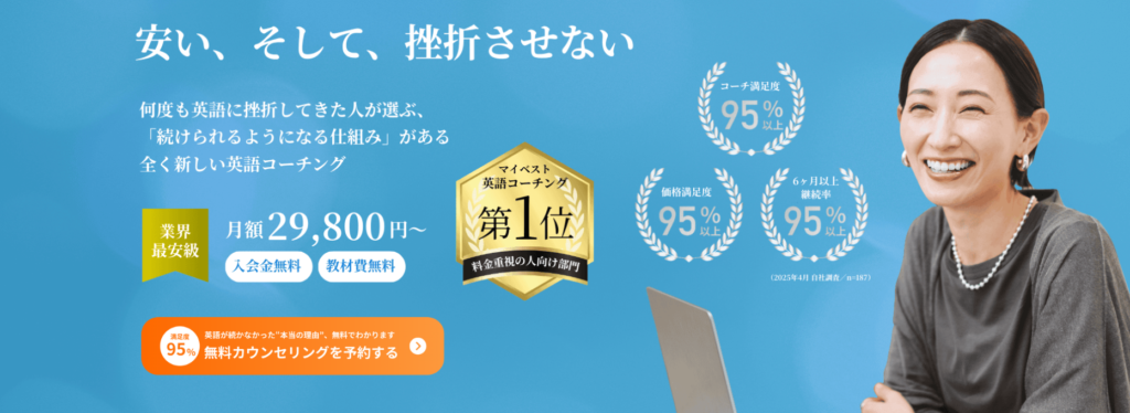 さらに、日本人コーチとの定期面談により学習方法の改善や進捗管理を行い、継続的に英語学習をサポートします。月額制で入会金が不要なため始めやすく、コストを抑えながら本格的な英語コーチングを受けたい社会人におすすめです。