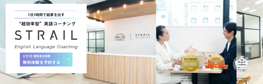 STRAIL(ストレイル)は、英語学習の「学習コンサルティング」に特化した英語コーチングサービスです。第二言語習得研究の知見をもとに、専属コンサルタントが受講者の英語力を分析し、最短で成果を出すための学習計画を作成します。