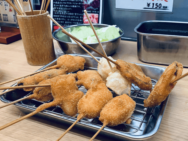 新世界・天王寺の名物グルメは、串カツや大衆食堂文化です。大阪の串カツはソースに浸して食べるのが特徴。時間が経っても衣はサクサクです。