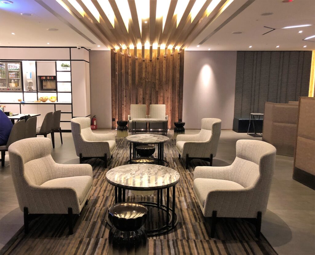プライオリティパスで利用でき、営業時間は毎日5:00〜23:00です。コンパクトなラウンジですが、ダイニングコーナーと落ち着いたシーティングエリアがバランスよく配置されています。