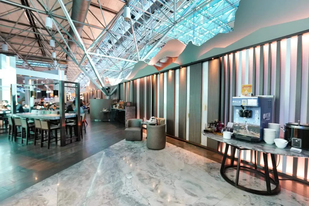 プライオリティパスで利用でき、最長3時間まで滞在可能です。営業時間は毎日5:00〜23:00で、食事はビュッフェ形式のほか、牛肉麺やルーローハンなどをその場で調理してくれるライブキッチンも充実しています。